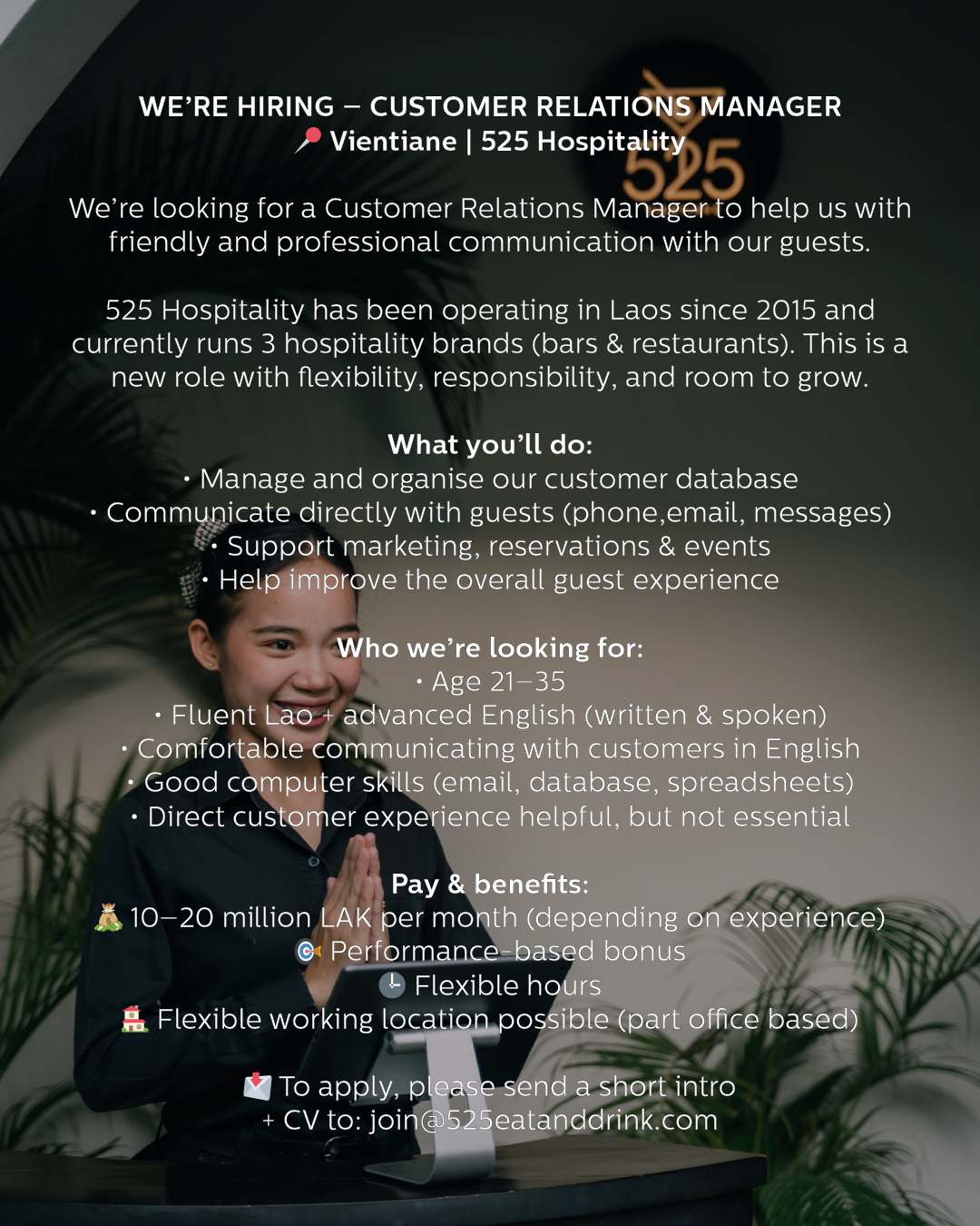 525 Hospitality has been operating in Laos since 2015 and currently runs 3 hospitality brands (bars & restaurants), 2 in Vientiane and 1 in Luang Prabang for a mix of customers - Lao, foreigners living in Vientiane and tourists.